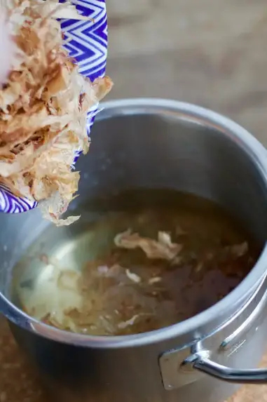 Wasser im Topf kochendes Wasser. Nun kommt das Katsuobushi auf einmal in den Topf. Da die Bonitoflocken aus getrocknetem Fisch hergestellt werden empfehlen wir fr Vegetarier die Dashi-Brhe mit Shiitakepilzen und Kombu Seetang anzusetzen.